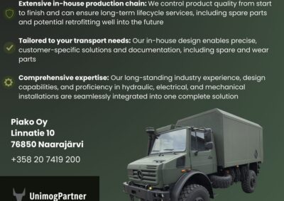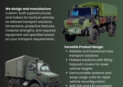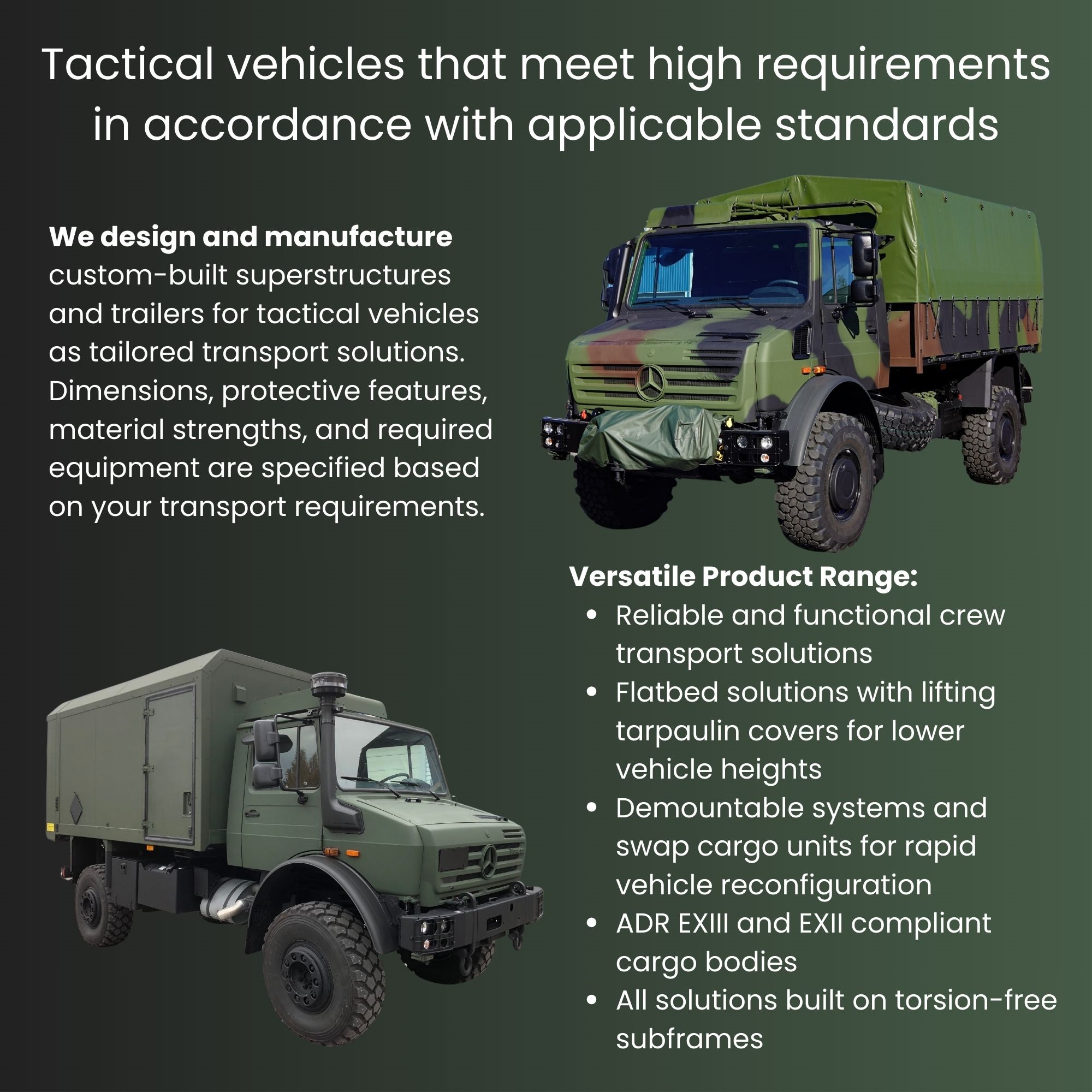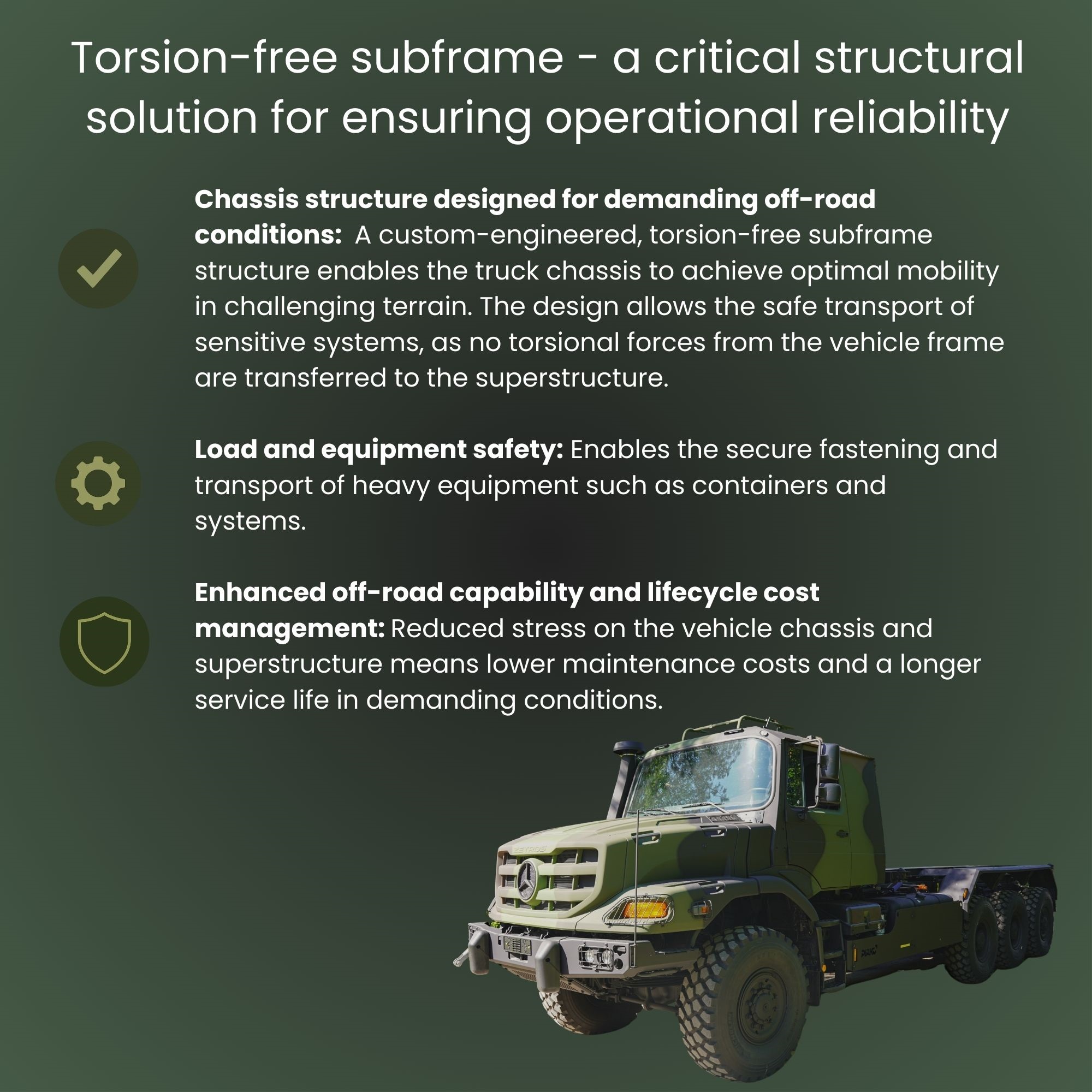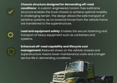 We design and implement product dimensions, material strengths, various protections, and necessary equipment according to your transport needs. Our tactical vehicle products are manufactured using a torsion-free subframe, which allows our products to withstand and function in even the most challenging terrain conditions. The torsion-free subframe enables the safe transport of sensitive systems, as no torsional forces from the vehicle frame are transferred to the superstructure. It also reduces stress on the vehicle chassis and superstructure, which enhances the off-road capabilities of the vehicle and results in lower maintenance costs and a longer service life in demanding conditions.